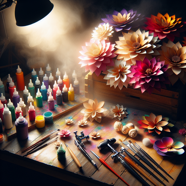 Image Prompt: A bright craft table covered in colorful sola wood flowers, paint supplies, an airbrush tool, and soft natural lighting.