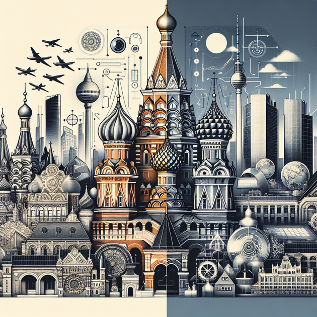 Image Prompt: A split scene showing Moscow’s classic architecture on one side and Berlin’s modern skyline on the other, symbolizing tradition versus innovation.